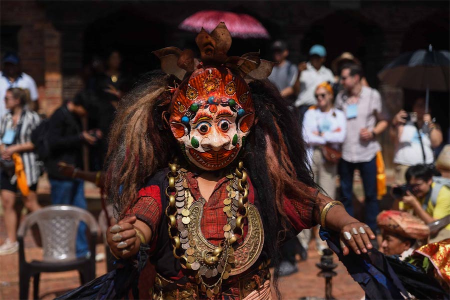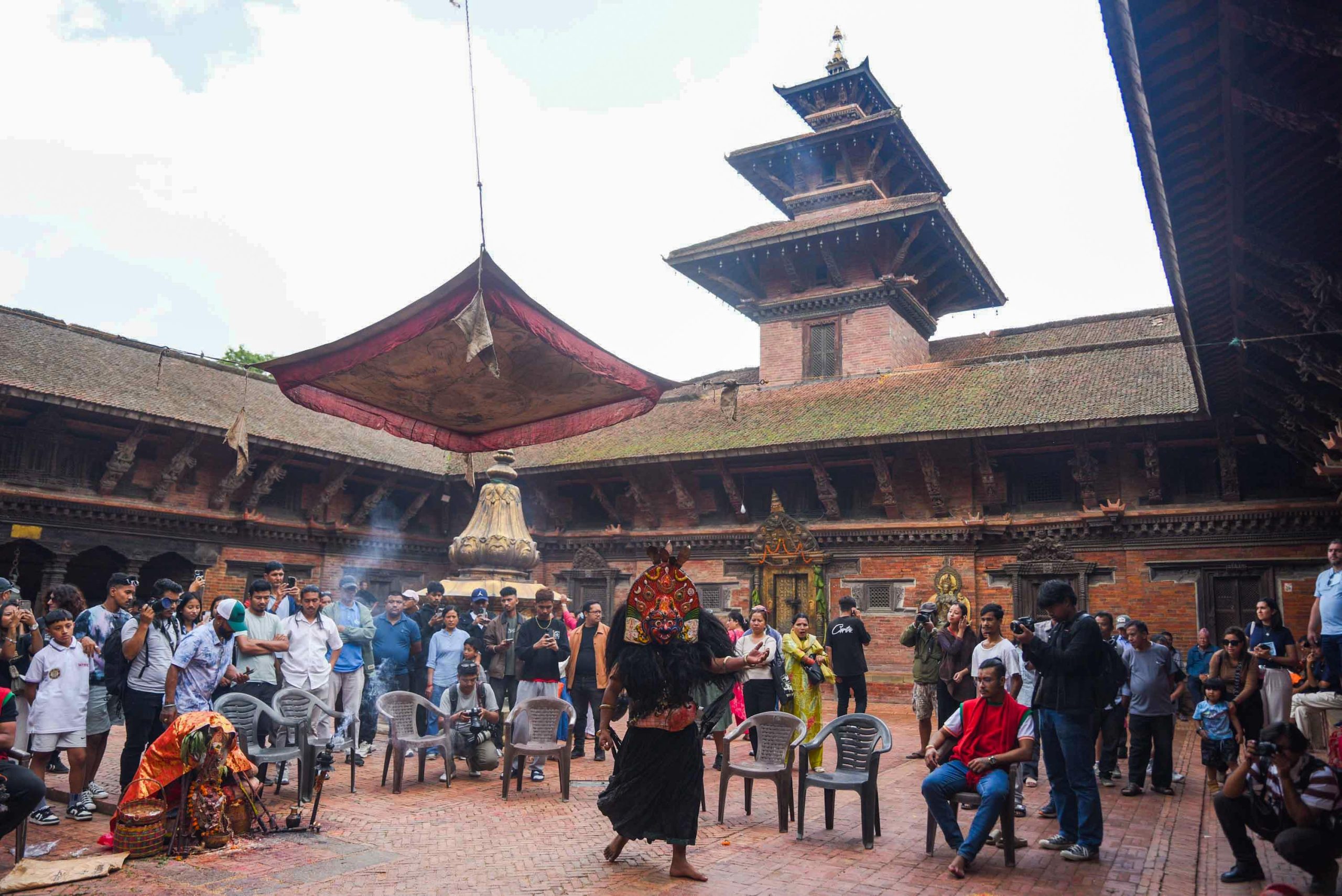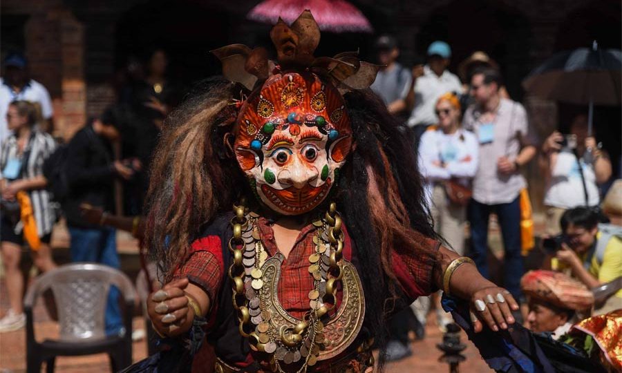 One of the ancient and sacred traditions of the Newar community, the Thecho Navadurga Dance, was performed at the Moolchowk courtyard of Patan Durbar Square. The ritual procession began from the goddess’s house in Thecho, where devotees dressed as deities (Devgan) in traditional attire and masks carried the main goddess (Mu Dya:), masks, ornaments, and ritual items to the historic Moolchowk.
